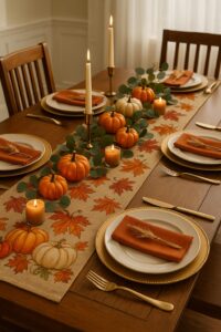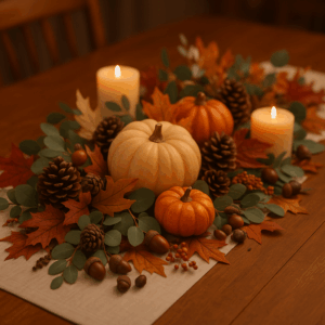Anchor your table with a runner or tablecloth. A neutral or burlap-style runner from Amazon pairs perfectly with fall accents, while Dollar Tree often carries seasonal plaid or leaf-printed placemats that add warmth for just a few dollars.